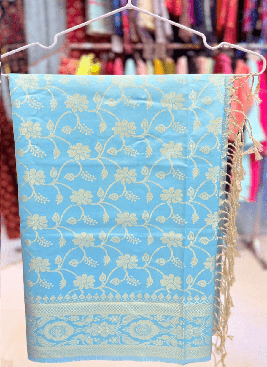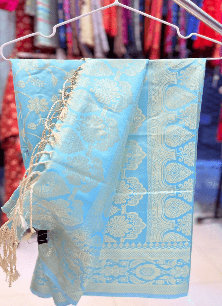 নিজেকে একটু অন্যরকম আর গর্জিয়াস লুকে দেখতে চাইলে বেছে নিন আমাদের এই Sky Blue (আকাশী নীল) বানারসী শাড়িটি। এর ডিজাইন যেমন মার্জিত, তেমনি এর রঙ আপনার মনে প্রশান্তি দেবে।