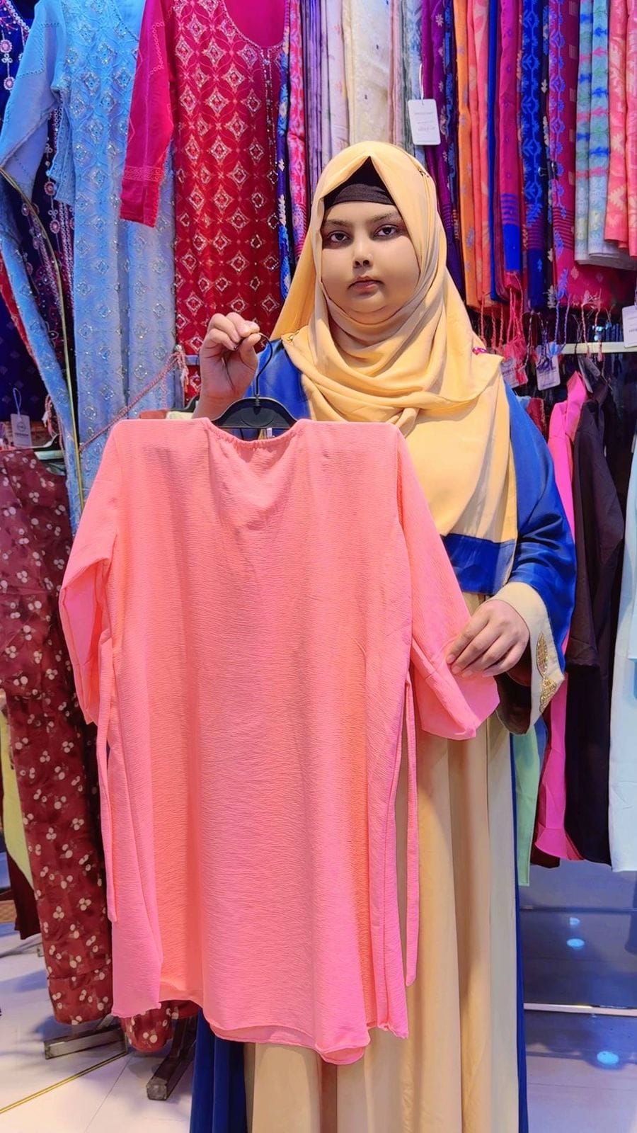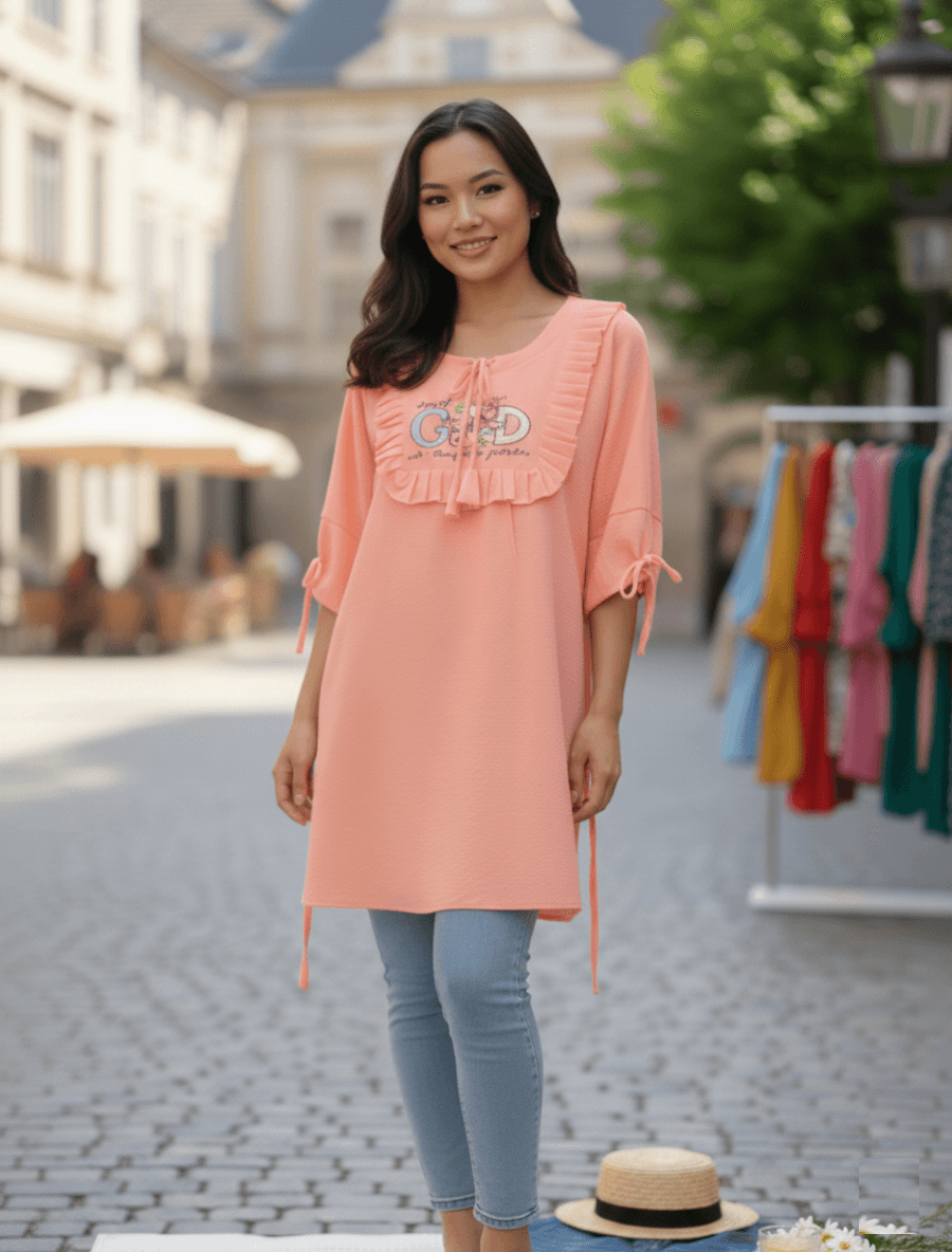 এই পিচ কালারের ক্যাজুয়াল টপসটি কমফোর্ট ও স্টাইল দুটোই একসাথে দেবে। সফট ও হালকা ফেব্রিকের কারণে দীর্ঘ সময় পরলেও আরামদায়ক থাকে। সামনের রাফল ডিজাইন এবং প্রিন্টেড ডিটেইলস টপসটিকে করেছে আধুনিক ও আকর্ষণীয়।